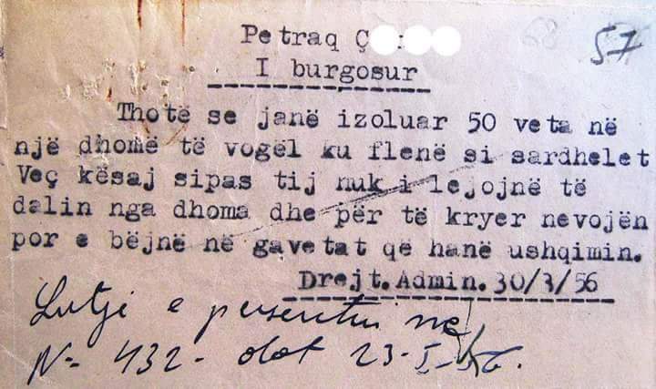 Një informacion për burgun nr.2 të Tiranës (sot te rruga “Mine Peza”) i vitit 1956.