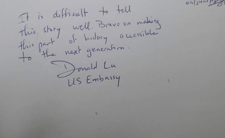“Është e vështirë të rrëfehet mirë kjo histori. Ju lumtë që po e bëni të prekshme për brezin e ri këtë pjesë të historisë.” Donald Lu -04.06.2017