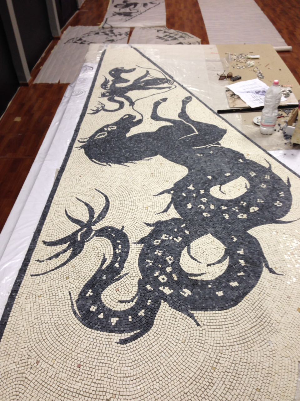 Mozaiku ndodhet 2.5m nën trotuarin e rrugës Kasem Durrësi, me një sipërfaqje rreth 50m2.