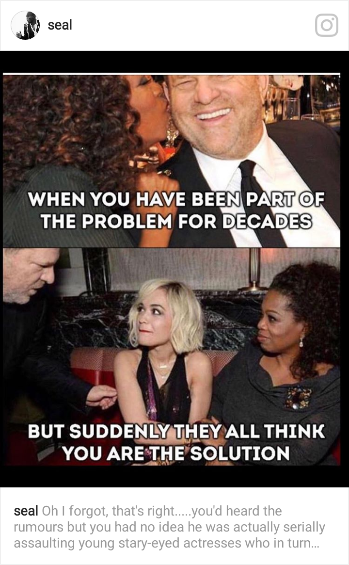 Pak ditë pas fjalimit të fuqishëm të manjates së medias në ndarjen e Çmimeve në Golden Globe ku Oprah u bë pjesë e nismës “Time’s up”-koha mbaroi për burrat në pushtet që heshtin për gratë, Seal publikoi një postim të zjarrtë në Instagram të mërkurën që përfshinte dy foto të Winfrey me producentin e akuzuar për ngacmime seksuale Harvey Weinstein. Akuzat e bëra publike kanë shkaktuar një vazhdë lajmesh për abuzim, ngacmim dhe sulm seksual ndaj femrave.
