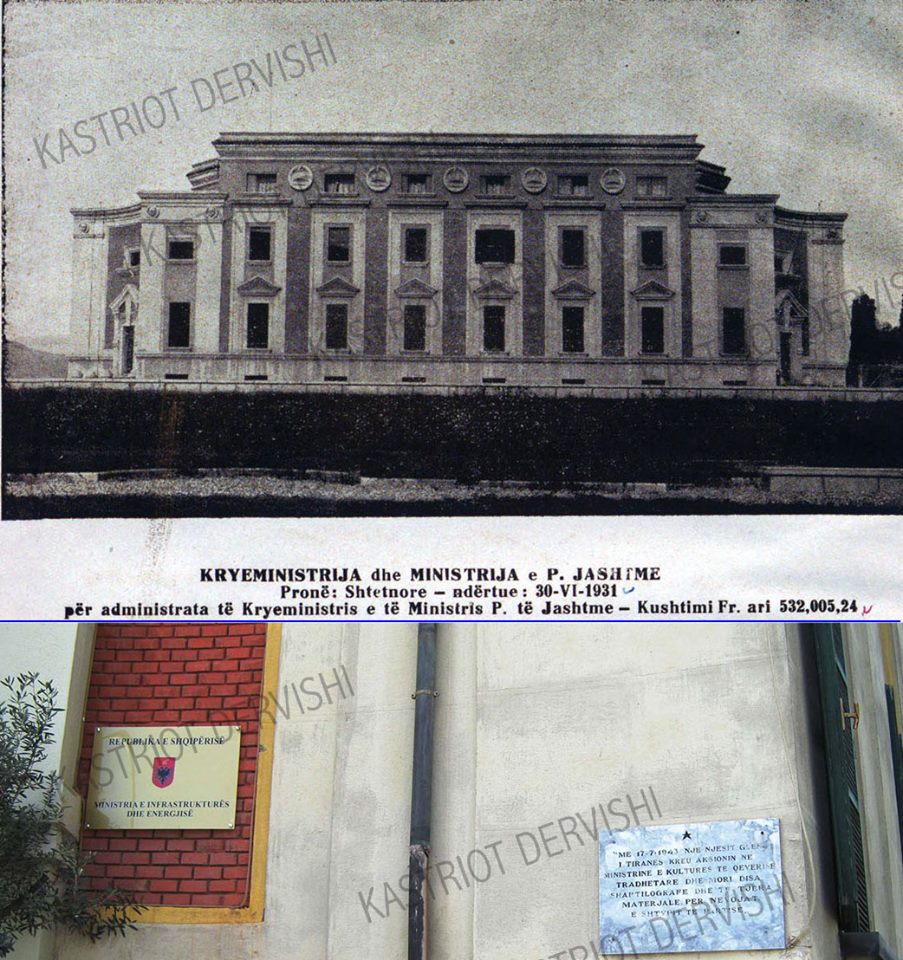 Po çfarë shenje ka sot në këtë godinë? Një pllakat i parëndësishëm, e për më tepër i vendosur jo në vendin e ngjarjes. Ky pllakat me yll të kuq komunist mbi krye është vendosur rreth vitit 2003 (mundet të ketë zëvendësuar një paraardhëse të vjetër). Më shumë rëndësi sesa historiku i kësaj godine kanë këto fjalë: “Më 17.7.1943, një njësit gueril i Tiranës kreu aksionin në Ministrinë e Kulturës të qeverisë tradhtare dhe mori disa shaptilografë për nevojat e shtypit të partisë”. Cila parti nuk thuhet, por ylli e kupton se vetëm një parti ka pasur. Shaptilografët e vjedhur janë më të rëndësishëm se kjo godinë historike. Në të vërtetë Ministrinë e Kulturës Popullore ka qenë në anën jugore të godinës dhe jo aty ku qëndron pllaka e vetme identifikuese.