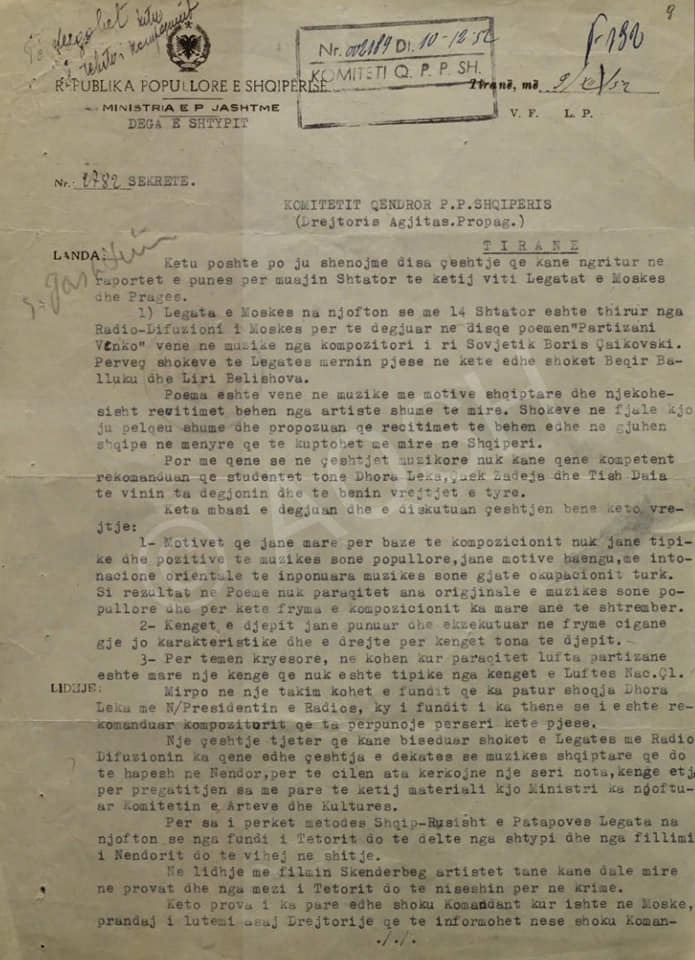 Në dokumentet e ish-Arkivit Qendror të Partisë, gjendet ky material ku për filmin “Skënderbeu” shkruhet se: “Ne lidhje me filmin Skenderbeg artistet tane kane dale mire ne provat dhe nga mezi i Tetorit do të niseshin per ne krime. Keto prova i ka pare edhe shoku Komandat kur ishte ne Moske, prandaj i lutemi asaj Drejtorie qe te informohet nese shoku Komandat ka nonje vrejtje ne lidhje me kete çeshtje per tja transmetuar Legates s’one ne Moske”.