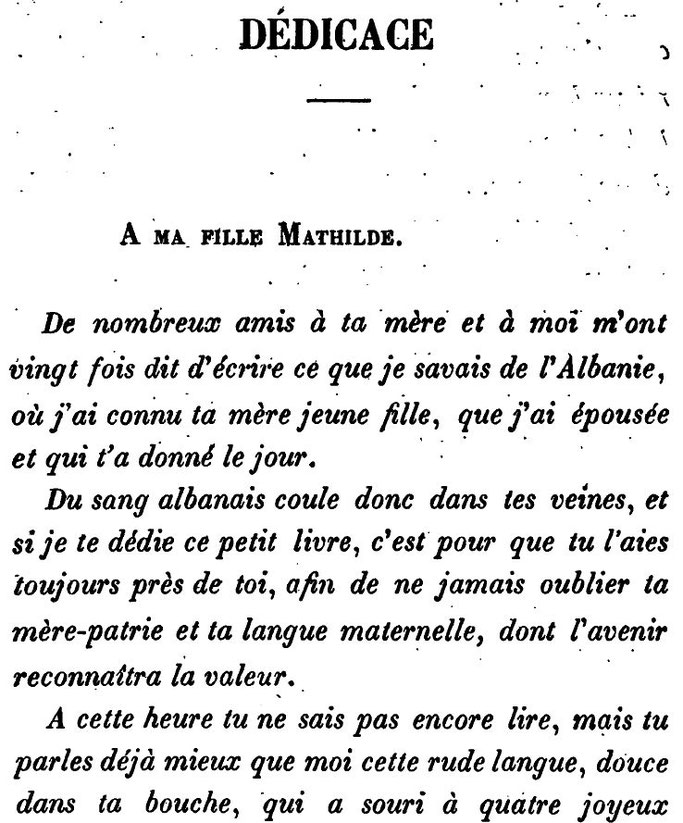 Në fillim të veprës me titull “Une race oubliée; les Pélasges et leurs descendants – Një racë e harruar ; Pellazgët dhe pasardhësit e tyre” të Edouard Schneider (Ish-shef inxhinier në Shkodër), botuar në Paris, në vitin 1894, gjejmë një dedikim special të vetë autorit për vajzën e tij, Mathilde. Blogeri Aurenc Bebja, nëpërmjet faqes së tij “Dars (Klos), Mat – Albania”, sjell përmbajtjen e tij për publikun shqiptar :
