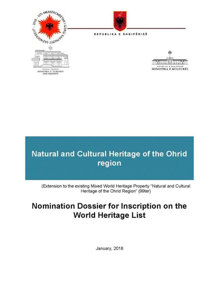 Dosja e Kandidimit të pjesës Shqiptare të Liqenit të Ohrit u dorëzua në Qendrën e Trashëgimisë Botërore UNESCO, brenda afateve për t’u marrë në shqyrtim në Mbledhjen e Komitetit të Trashëgimisë Botërore 42COM e planifikuar të zhvillohet në Manama, Bahrain në korrik 2018.