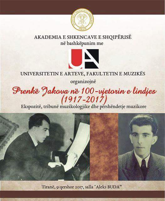 Prenkë Jakova në 100-vjetorin e lindjes (1917-2017)” titullohet aktiviteti që organizohet nga Akademia e Shkencave të Shqipërisë në bashkëpunim me Universitetin e Arteve dhe Fakultetin e Muzikës. E cilesuar si tribunë muzikologjike me eskpozitë dhe përshëndetje muzikore, takimi për nder të Jakovës mbahet në Tiranë, me 9 qershor 2017, salla “Aleks BUDA”. Ekspozita shfaq fotografi dhe partitura muzikore” ndërsa pas saj është edhe “Tribuna muzikologjike” kushtuar jetës dhe krijimtarisë së kompozitorit Prenkë Jakova. Kumtesat që mbahen janë disa. Prof. Dr. Isak Shehu ka kumtesën “Shkodra, djepi i shkollës së parë shqiptare të edukimit muzikor dhe Prenkë Jakova, një përfaqësues i denjë i saj”, Prof. Dr. Fatmir Hysi “Prenk Jakova – Kompozitor shumëplanësh me frymëzim të thellë njerëzor”, Dr. Eno Koҫo: “Prenka në ndjesinë time gjatë periudhës së “Skënderbeut” të tij”, akademik Vasil S. Tole: “Prenkë Jakova, si kompozitor atipik”, Dr. Pandi Bello: ”Fati historik i kompozitorit Prenk Jakova”, Dr. Spiro Kalemi “Prenkë Jakova dhe ne”, Dr. Mikaela Minga: “Prenkë Jakova midis kulturës muzikore urbane dhe asaj nacionale”. Në fund ka përshëndetje muzikore “a cappella” me krijimtarinë e Jakovës” nga kori polifonik i Shoqatës Kulturore Artistike “Prenkë Jakova” – Shkodër.