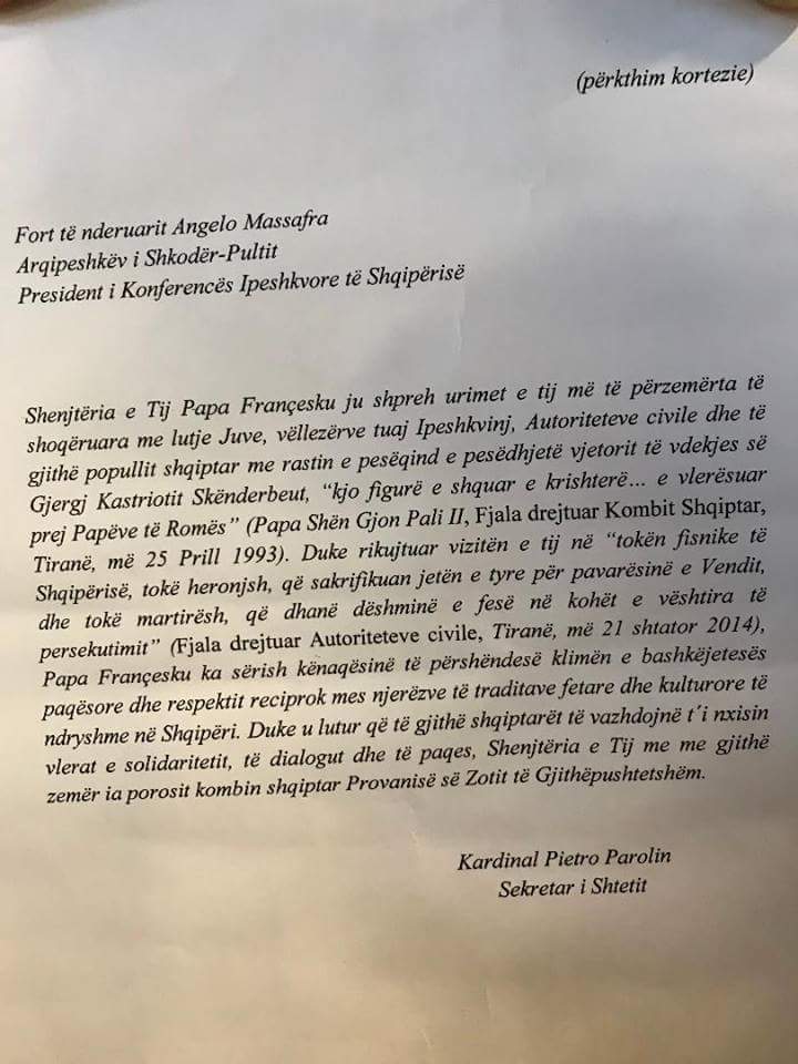 Shenjtëria e Tij, Papa Françesku, ju shpreh urimet më të përzemërta, të shoqëruara me lutje, Juve, vëllezërve tuaj ipeshkvij, autoriteteve civile dhe të gjithë popullit shqiptar, me rastin e 550-vjetorit të vdekjes së Gjergj Kastriotit Skënderbeut, “kësaj figure të shquar të krishterë… vlerësuar prej Papëve të Romës” (Papa Shën Gjon Pali II, Fjala drejtuar kombit shqiptar, Tiranë, më 25 prill 1993). Duke kujtuar vizitën e tij në “tokën fisnike të Shqipërisë, tokë heronjsh, që flijuan jetën e tyre për pavarësinë e vendit dhe, tokë martirësh, që dhanë dëshminë e fesë në kohët e vështira të persekutimit” (Fjala drejtuar autoriteteve civile në Tiranë, më 21 shtator 2014), Papa Françesku ka sërish kënaqësinë të përgëzojë për klimën e bashkëjetesës paqësore dhe të respektit reciprok mes njerëzve të traditave fetare dhe kulturore të ndryshme në Shqipëri. Duke u lutur që të gjithë shqiptarët të vazhdojnë t’i nxisin vlerat e solidaritetit, të dialogut dhe të paqes, Shenjtëria e Tij, me gjithë zemër, ia porosit kombin shqiptar Provanisë së Zotit të Gjithpushtetshëm.