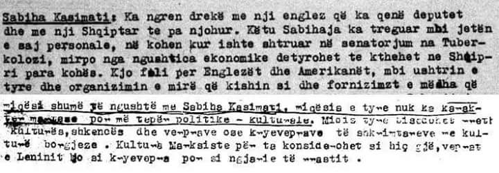 Shkencëtarja Sabiha Kasimati ra viktimë e urrejtjes, smirës, zilisë, ligësisë, cilësi këto që gjendeshin me shumicë te përfaqësuesit e regjimit komunist. Mjafton një fakt i thjeshtë: oficeri i Sigurimit që përgatiste dosjen e Sabihasë ishte me arsim fillor e me profesion rrobaqepës. Me rastin e pushkatimit të Sabihasë së bashku me 21 të tjerë më 26.2.1951 dhe dy të tjerëve në 21 qershor, po të atij viti, kujtojmë dy raporte të organeve të punëve të brendshme për të.