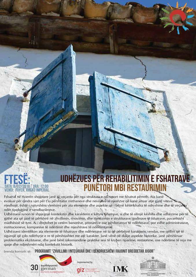 Në kuadër të projektit “Zhvillimi i Integruar dhe i Qëndrueshëm i Rajonit Bregdetar Jugor”, zbatuar nga GIZ në Shqipëri, u zhvillua sot një workshop mbi “Udhëzuesin për Rehabilitimin e Fshatrave të Himarës”, pjesë e së cilit ishin specialistë nga Instituti i Monumenteve të Kulturës, ekspertë, përfaqësues nga institucione qendrore, rajonale e vendore si dhe institucione të arsimit të lartë.