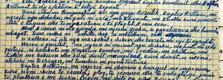 -Kur isha me temperaturë 40 nga gripi aziatik, kapter Asllani më ngriti nga dysheku, me futi në qeli, më zhveshi, më zbathi kur çimentoja ishte e lagur dhe temperatura e të ftohtit (ishte) 8 (gradë) nën zero. Mbas 8 orëve, në atë gjendje, më ngriu gjaku, u paralizova dhe humba ndjenjat. Kur erdha në vete, pashë se ndodhesha në dhomë. U ktheva në jetë nga masazhet e shokëve dhe borseta me ujë të ngrohtë.